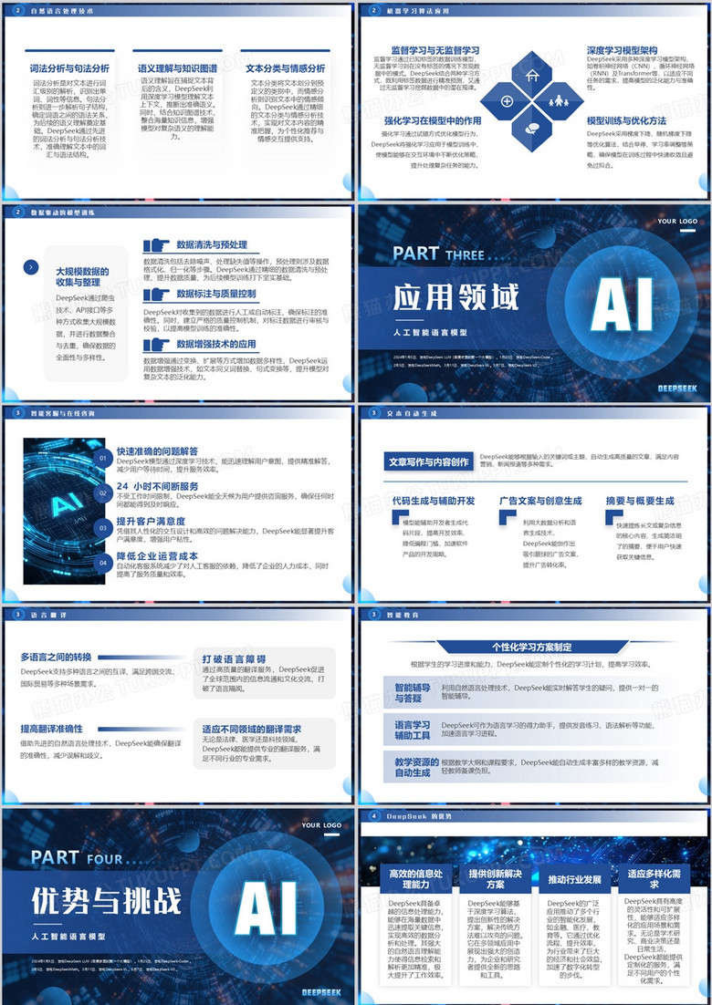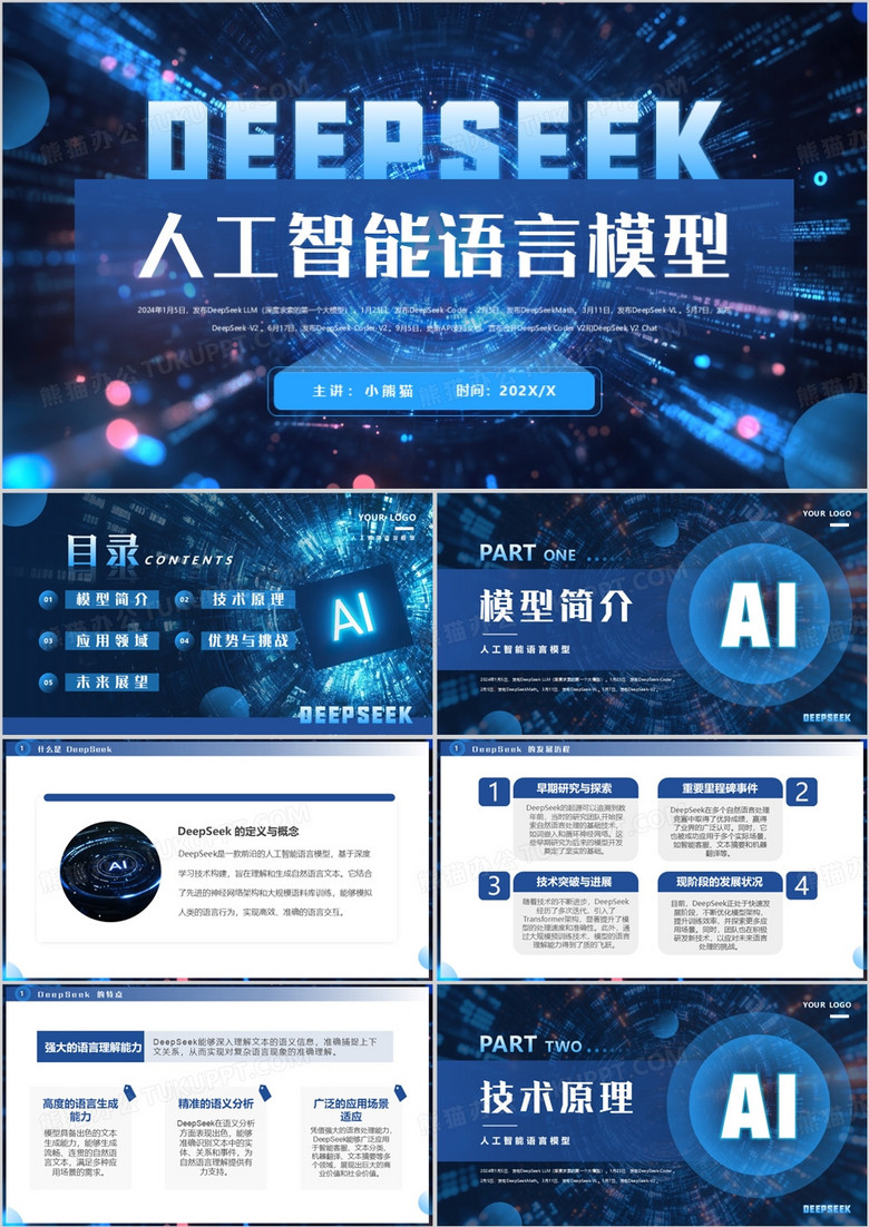 本作品内容为蓝色DeepSeek人工智能语言模型介绍PPT模板, 格式为 pptx, 大小22 MB, 页数为23,比例16:9, 请使用软件PowerPoint(2016)打开, 作品中主体文字及图片可替换修改,文字修改可直接点击文本框进行编辑,图片更改可选中图片后单击鼠标右键选择更换图片,也可根据自身需求增加和删除作品中的内容, 源文件无水印。 如认为平台内容涉嫌侵权,可通过邮件提出书面通知,我们将及时处理。