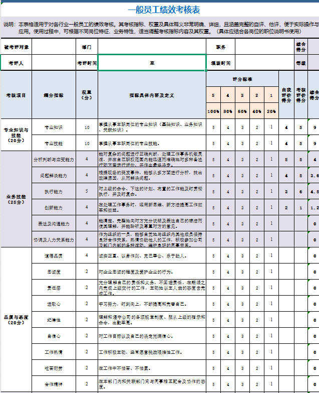 本作品内容为一般员工绩效考核excel模板, 格式为 xls, 大小1 MB, 请使用软件Excel(2016)打开, 作品中主体文字及图片可替换修改,文字修改可直接点击文本框进行编辑,图片更改可选中图片后单击鼠标右键选择更换图片,也可根据自身需求增加和删除作品中的内容, 源文件无水印, 欢迎使用。 如认为平台内容涉嫌侵权,可通过邮件提出书面通知,我们将及时处理。
