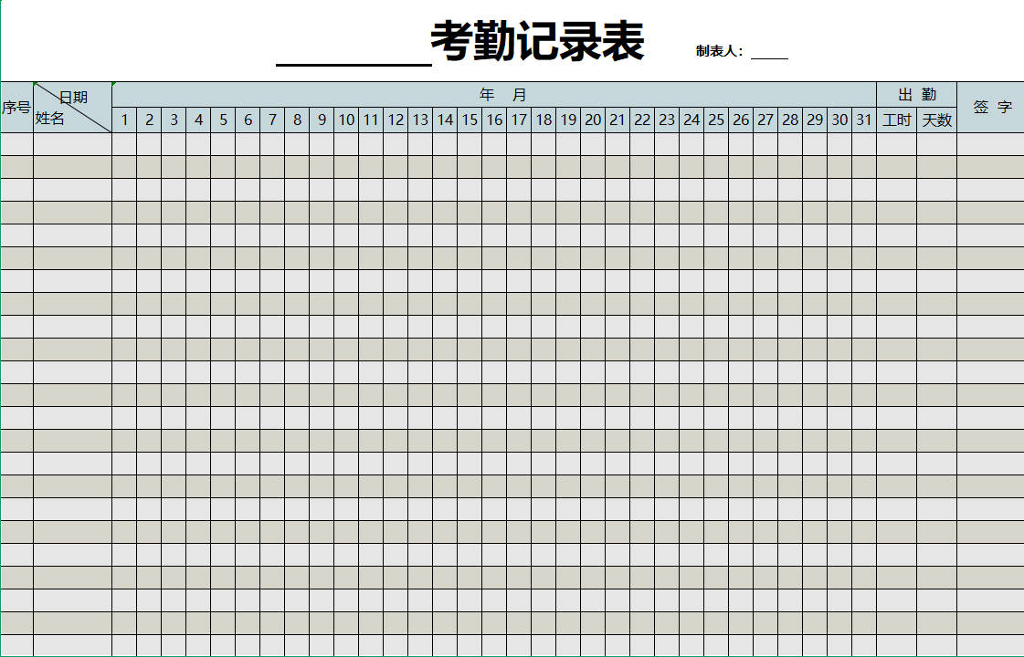 本作品内容为通用考勤记录表模板, 格式为 xlsx, 大小1 MB, 请使用软件Excel(2016)打开, 作品中主体文字及图片可替换修改,文字修改可直接点击文本框进行编辑,图片更改可选中图片后单击鼠标右键选择更换图片,也可根据自身需求增加和删除作品中的内容, 源文件无水印, 欢迎使用。 如认为平台内容涉嫌侵权,可通过邮件提出书面通知,我们将及时处理