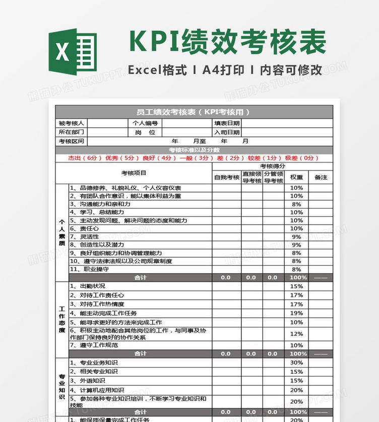 本作品内容为KPI绩效考核表, 格式为 xls, 大小1 MB, 请使用软件Excel(2007)打开, 作品中主体文字及图片可替换修改,文字修改可直接点击文本框进行编辑,图片更改可选中图片后单击鼠标右键选择更换图片,也可根据自身需求增加和删除作品中的内容, 源文件无水印, 欢迎使用。 如认为平台内容涉嫌侵权,可通过邮件提出书面通知,我们将及时处理。