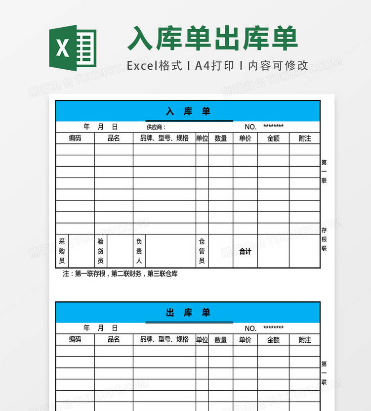本作品内容为公司产品出库单及入库单excel表格模板, 格式为 xlsx, 大小1 MB, 请使用软件Excel(2016)打开, 作品中主体文字及图片可替换修改,文字修改可直接点击文本框进行编辑,图片更改可选中图片后单击鼠标右键选择更换图片,也可根据自身需求增加和删除作品中的内容, 源文件无水印, 欢迎使用。 如认为平台内容涉嫌侵权,可通过邮件提出书面通知,我们将及时处理。