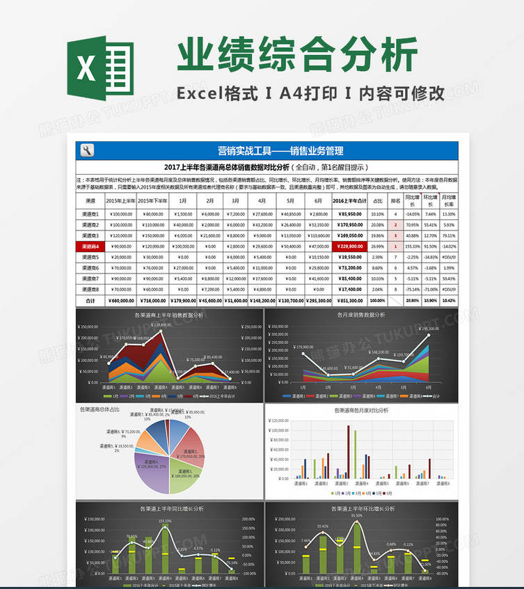 本作品内容为商销售业绩综合分析excel模板, 格式为 xlsx, 大小1 MB, 请使用软件Excel(2016)打开, 作品中主体文字及图片可替换修改,文字修改可直接点击文本框进行编辑,图片更改可选中图片后单击鼠标右键选择更换图片,也可根据自身需求增加和删除作品中的内容, 源文件无水印, 欢迎使用。 如认为平台内容涉嫌侵权,可通过邮件提出书面通知,我们将及时处理。
