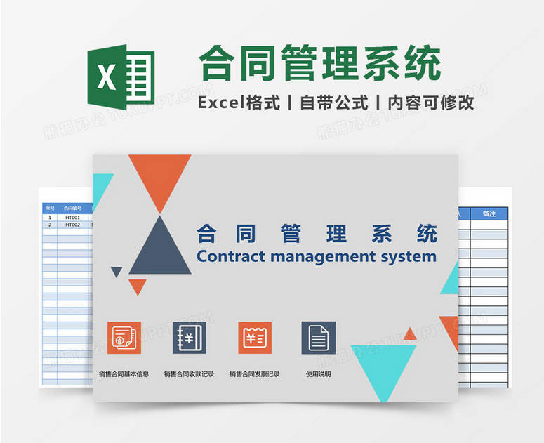 本作品内容为合同Excel管理系统, 格式为 xlsx, 大小1 MB, 请使用软件Excel(2016)打开, 作品中主体文字及图片可替换修改,文字修改可直接点击文本框进行编辑,图片更改可选中图片后单击鼠标右键选择更换图片,也可根据自身需求增加和删除作品中的内容, 源文件无水印, 欢迎使用。 如认为平台内容涉嫌侵权,可通过邮件提出书面通知,我们将及时处理。