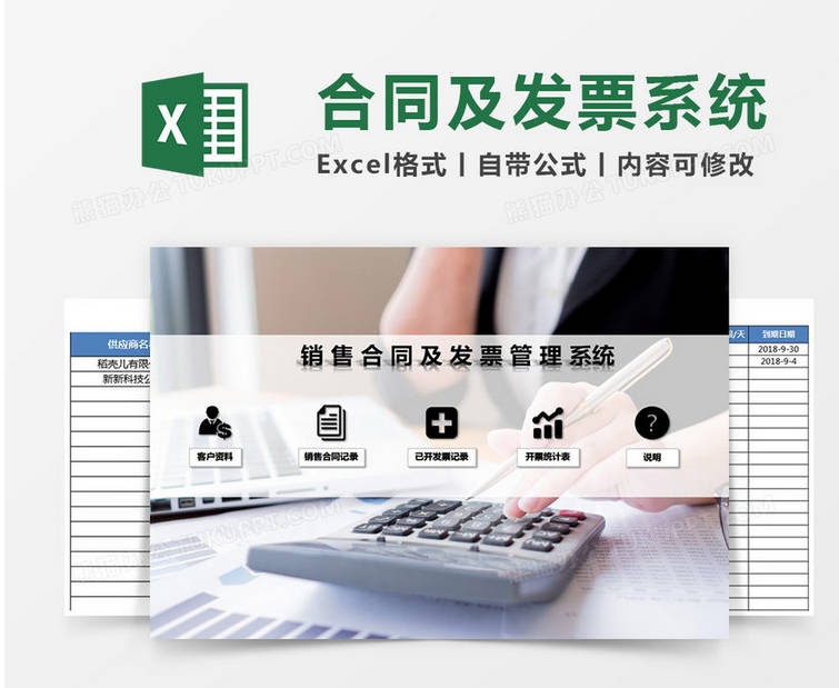 本作品内容为销售合同及发票管理系统excel表格, 格式为 xlsx, 大小2 MB, 请使用软件Excel(2016)打开, 作品中主体文字及图片可替换修改,文字修改可直接点击文本框进行编辑,图片更改可选中图片后单击鼠标右键选择更换图片,也可根据自身需求增加和删除作品中的内容, 源文件无水印, 欢迎使用。 如认为平台内容涉嫌侵权,可通过邮件提出书面通知,我们将及时处理。