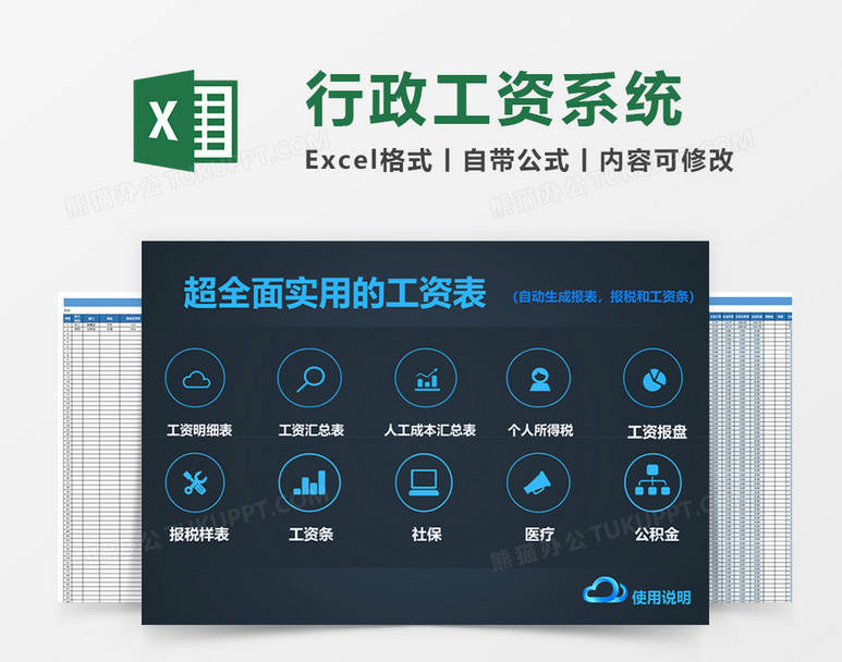 本作品内容为实用的行政工资管理系统excel表格模板, 格式为 xlsx, 大小1 MB, 请使用软件Excel(2016)打开, 作品中主体文字及图片可替换修改,文字修改可直接点击文本框进行编辑,图片更改可选中图片后单击鼠标右键选择更换图片,也可根据自身需求增加和删除作品中的内容, 源文件无水印, 欢迎使用。 如认为平台内容涉嫌侵权,可通过邮件提出书面通知,我们将及时处理。