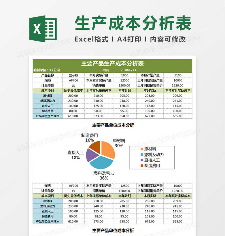 本作品内容为产品生产成本分析Execl表格, 格式为 xlsx, 大小1 MB, 请使用软件Excel(2016)打开, 作品中主体文字及图片可替换修改,文字修改可直接点击文本框进行编辑,图片更改可选中图片后单击鼠标右键选择更换图片,也可根据自身需求增加和删除作品中的内容, 源文件无水印, 欢迎使用。 如认为平台内容涉嫌侵权,可通过邮件提出书面通知,我们将及时处理。